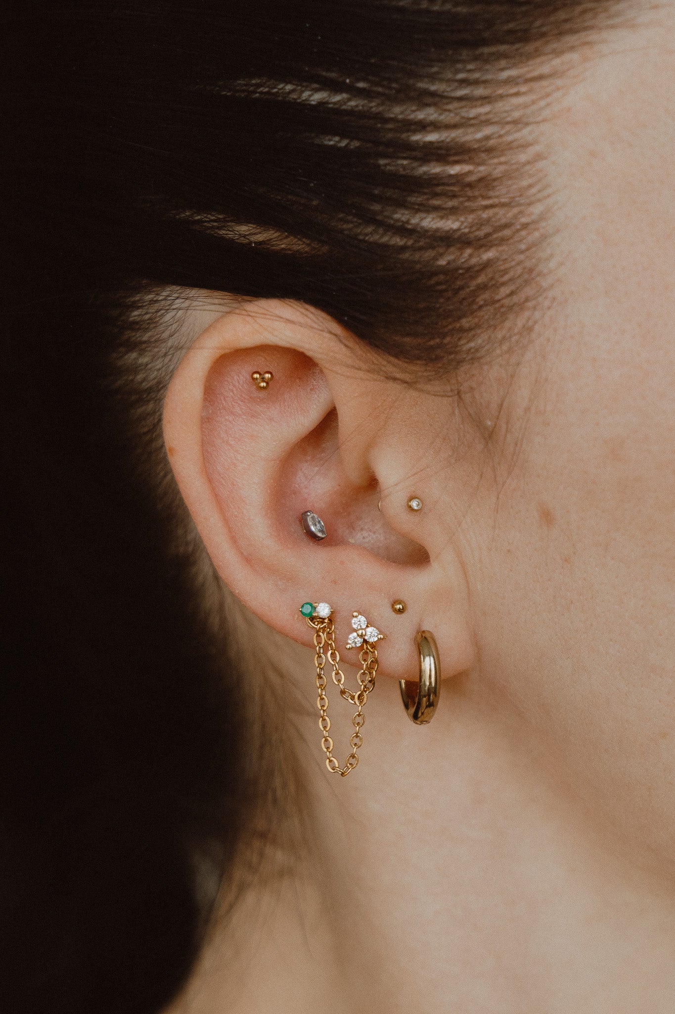An instant way to elevate your ear stack. The Althorp Chain is a delicate double-layered connector that links two flat-back earrings to create a graceful dangle effect. Lightweight and endlessly versatile, it adds subtle movement and a touch of modern royalty to any look, perfect for those who love to customize their sparkle.